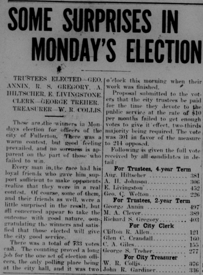 George Anin, R.S. Gregory, August Hiltscher, and E. Livingstone were elected to the City Board of Trustees (now called City Council).