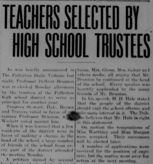 In 1914, the principal of FUHS was Delbert Brunton, and teachers were chosen by the Board of Trustees.