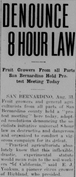 There was a proposition on the 1914 ballot (evidently put there by socialists) to establish an 8-hour work day. It’s something we take for granted today, but it was a radical idea back then. It was opposed by powerful business interests, and ultimately failed to pass.