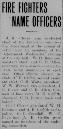 In 1908 following a big fire downtown, Fullerton created its first volunteer fire department. In 1914, they approved bonds for a fire truck and named officers. J.M. Clever was chosen as chief.