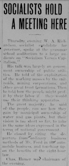 In the early 20th century, there was a small but active Socialist Party in California. They sometimes held meetings in Fullerton. They were in favor of government ownership of utilities, the 8-hour work day, and other reforms.