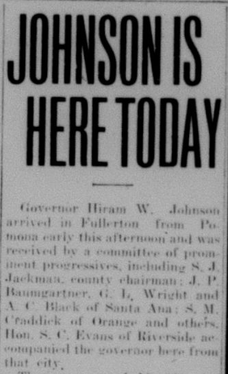 Progressive Governor Hiram Johnson made a stop in Fullerton, running for re-election. He was introduced by high school principal Delbert Brunton, and gave a speech about progressive reforms created under his administration.