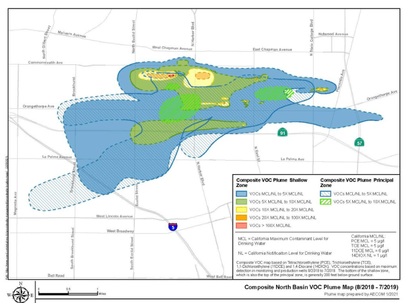 One unfortunate consequence of bringing industry to Fullerton was a legacy of pollution, specifically groundwater contamination. As a direct result of manufacturing in the southern industrial area of Fullerton and north Anaheim, Fullerton now has a Superfund site called the North Basin Contamination, a 5-mile plume of industrial solvents that threaten local groundwater. Here is a map of the plume.