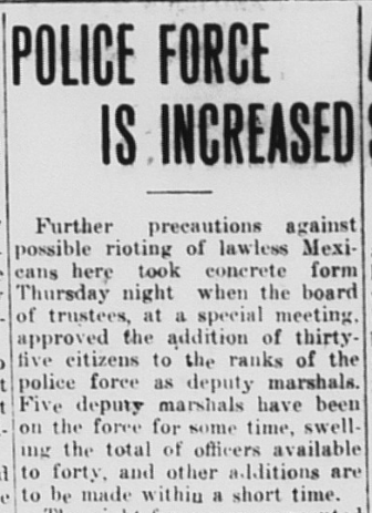 “Further precautions against possible rioting of lawless Mexicans here took concrete form Thursday night when the board of trustees, at a special meeting, approved the addition of thirty-five citizens to the ranks of the police force as deputy marshals…Five deputy marshals have been on the force for some time, swelling the total of officers available to forty, and other additions are to be made within a short time.