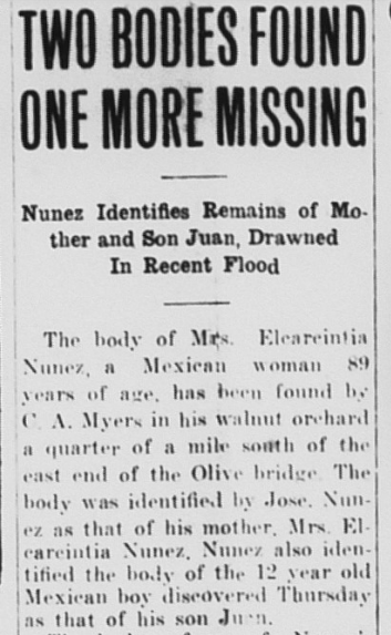 From the above article: “The body of Mrs. Eleareintia Nunez, a Mexican woman 89 years of age, was found by C.A. Myers in his walnut orchard. The body was identifited by Jose Nunez as that his mother, Mrs. Elcarcintia Nunez. Nunez also identified the body of the 12 year old Mexican boy discovered Thursday as that of his son Juan.