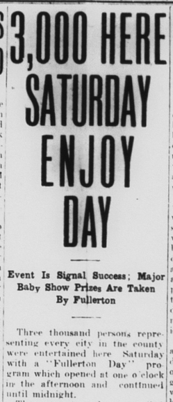 The Local History Room of the Fullerton Public Library has microfilm from the Fullerton Tribune newspaper (which became the Orange County Tribune in 1908) stretching back to 1893. I am in the process of reading over the microfilm, year by year, to get a sense of what was happening in the town over the years, and creating a mini archive. Below are some news stories from 1916.