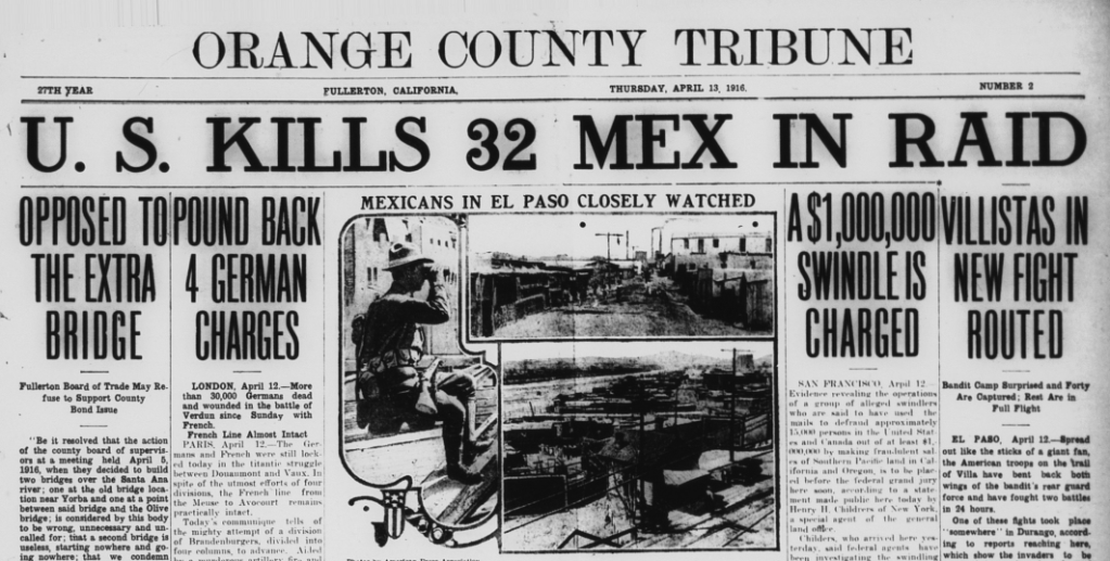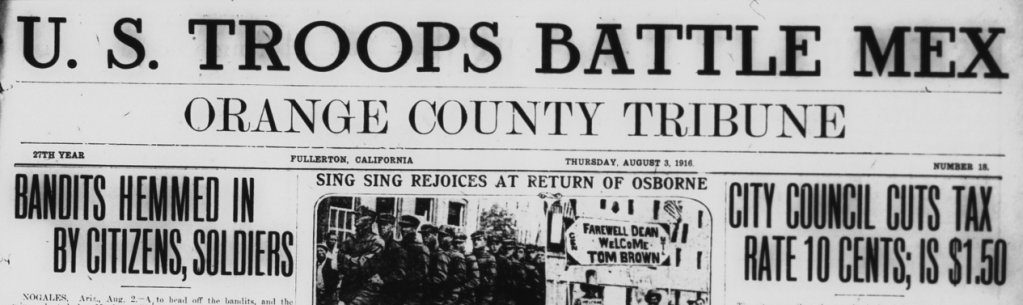 The front pages of the Tribune often had big headlines, photos, and stories about the threat south of the border, and clashes between U.S. soldiers, under the command of General Pershing, and Villa’s fighters.