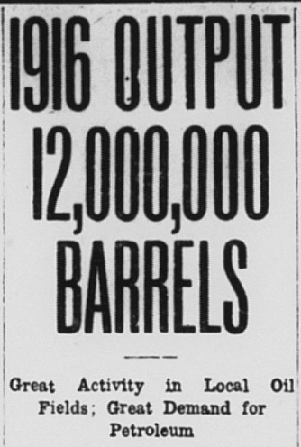 Oil and oranges were the two biggest local industries. The local output of oil in 1916 was 12,000,000 barrels. The Southern California citrus output was 32,000 carloads.