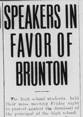 In 1916, long time high school principal Delbert Brunton was essentially fired by the High School Board of Trustees, for reasons unclear. This prompted strong backlash among students and parents, who showed up at meetings to speak in support of Brunton.