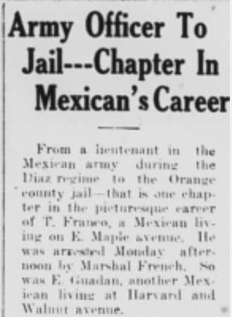 A Mexican man named T. Franco, who had served in the Mexican army under Porfirio Diaz and then immigrated to the United States (specifically Fullerton) was arrested after a drunken brawl. An article printed in the Tribune suggests that he was disloyal to the United States.