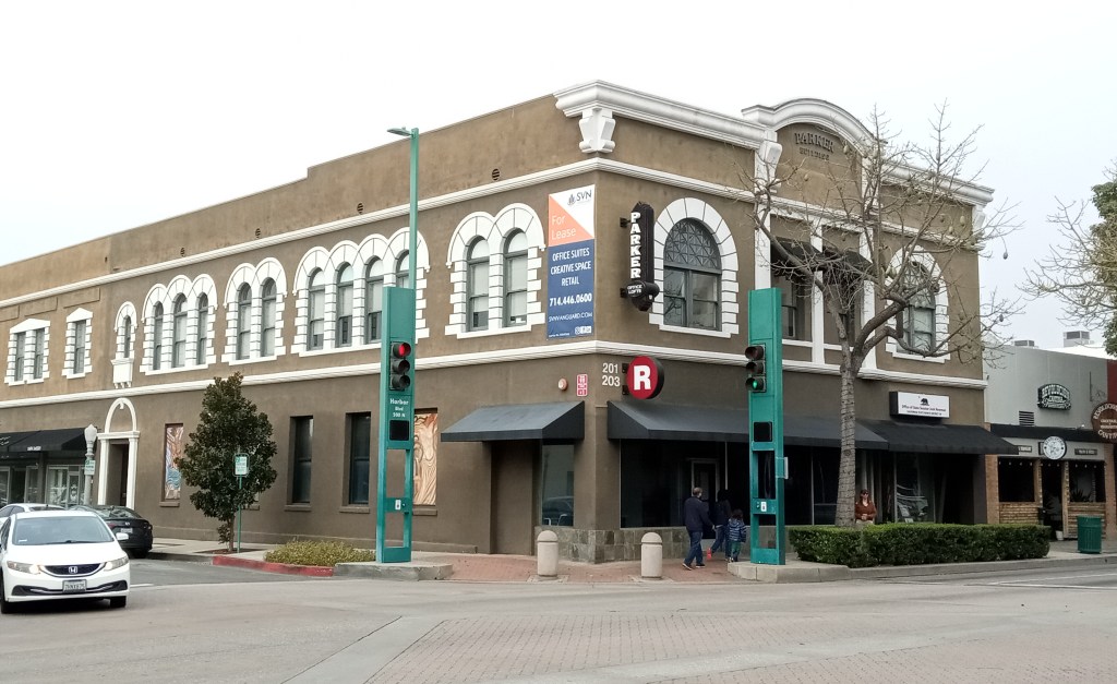 For this series, I compare a historic photo of Fullerton with a contemporary one from approximately the same angle. Below are two photographs of the northwest corner of Harbor Blvd. and Amerige Ave.–one of the original Masonic Temple (early 20th century), and the other of what is now called the Parker Building, from 2023. The building is relatively unchanged. The Masonic Temple moved from this location to a larger one on Harbor and Chapman (now the Springfield Banquet Center) in 1920.