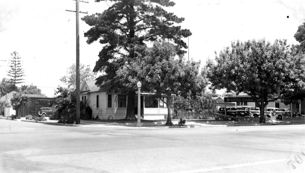 For this series, I compare a historic photo of Fullerton with a contemporary one from approximately the same angle. Below are two photographs of the northeast corner of Commonwealth and Highland Avenues–one of houses from the 1930s and the other of what was once City Hall (built in 1941) and is now the Police Station, from 2023.
