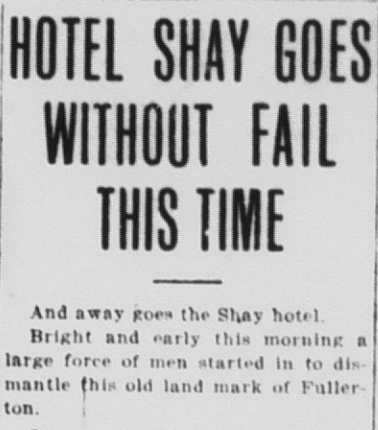 “Bright and early this morning a large force of men started in to dismantle this old land mark of Fullerton,” the above article states. “George Amerige, the proprietor, has sold the building to the Whiting Wrecking Company of Los Angeles for wrecking purposes and the work of razing the old structure has started. Big signs with white background and black lettering have been plastered all over the exterior of the building which read “Watch It Go.”