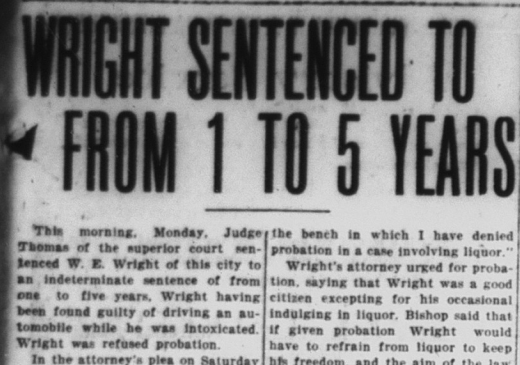 In crime news, a local man named W. E. Wright drunkenly drove his car through a patriotic event, injuring four people. He was found guilty and sentenced to from 1 to 5 years.