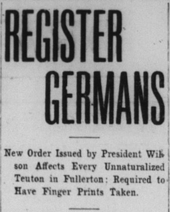 “The order coming from President Wilson, affects every unnaturalized German in the United States and a number in this city will be affected by the order,” the above article states. “The order requires every German citizen to make our four affidavits setting forth his age, residence business, friends, habits, and many other important subjects…After once being registered the German may not move from his place of residence without the approval of the postmaster, who will record the new residence. The finger prints of each man will be taken by the police and kept as a part of the identification. In cities more than 5,000 the chief of police will be required to register the Germans.”