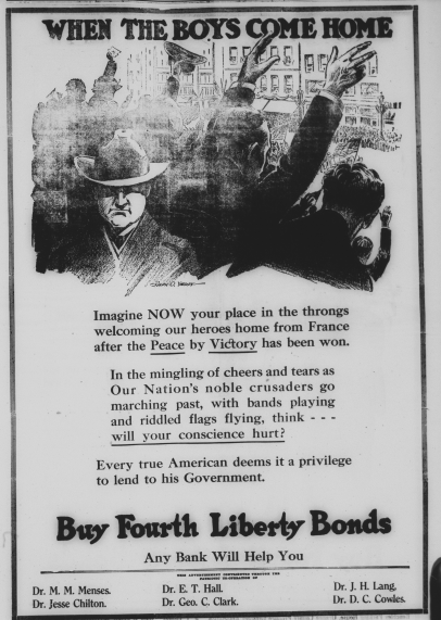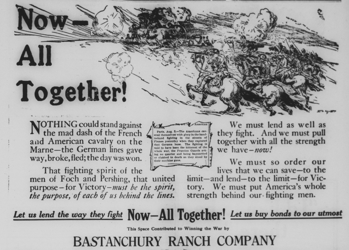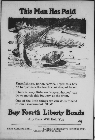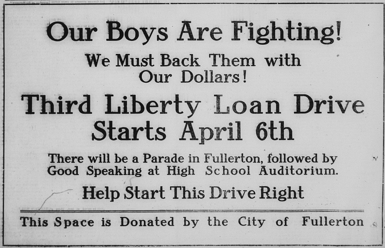 The pages of both Fullerton newspapers, the Tribune and the News included large propaganda advertisements for Liberty loans and bonds. Here are some of them: