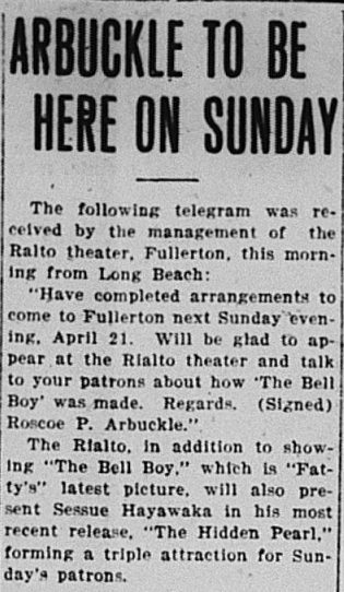 Popular entertainer Roscoe “Fatty” Arbuckle made a special appearence at The Rialto.