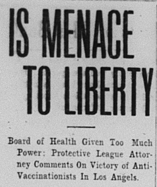 The above article, which is actually about smallpox vaccination, but presumably also included influenza vaccination, states, “Marshall Stimson, attorney for the Public School Protective League, in a statement commenting on the victory of opponents to enforced vaccination in Judge Wellborn’s court in Los Angeles, asserted that the proceedings showed that the tendency of boards of health to arrogate more and more power was constituting a serious menace to individual liberty.”