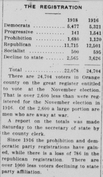Voter registration numbers showed that Orange County in 1918 was a predominantly Republican region. It would remain so until around 2018.
