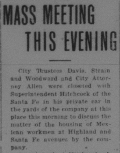 “City Trustees Davis, Strain, and Woodward and City Attorney Allen were closeted with Superintendent Hitchcock of Hitchcock of the Santa Fe in his private car in the yards of the company at this place this morning to discuss the matter of the housing of Mexican workers at Highland and Santa Fe avenues by the company,” the Tribune reported. “A mass meeting has been called for this evening at the city hall for taking action.”