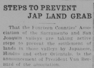 “That the Fourteen Counties’ Association of the Sacramento and San Joaquin Valleys are taking active steps to prevent the settlement of lands in those valleys by Japanese, Hindus, and other Orientals, is the announcement of President Van Bernard of the association,” the Tribune reported.