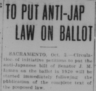 “Circulation of initiative petitions to put the anti-Japanese bill of Senator J.M. Inman on the ballot in 1920 will be started immediately following the publication of the complete text of the proposed law,” the Tribune reported. “Senator Inman who is president of the State Anti-Japanese association which will circulate the petitions, stated that the nine sections of the law will positively prohibit Japanese or other aliens ineligible to citizenship from owning or leasing agricultural land in California.”