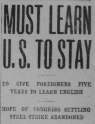 “Deportation of immigrants after five years residence in the United States unless they learn to speak and read English will be considered by the Senate labor committee, following its investigation of the steel strike, Chairman Kenyon announced on his return from Pittsburg,” the Tribune reported. “Senators on the investigating committee declared Americanization of foreign-born persons must be undertaken at once if grave industrial trouble is to be averted.”