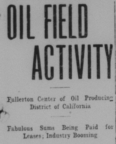 In 1919, Fullerton’s two biggest industries were oranges and oil. Nearly every issue of the Tribune included articles about new wells and big gushers coming in the local fields.