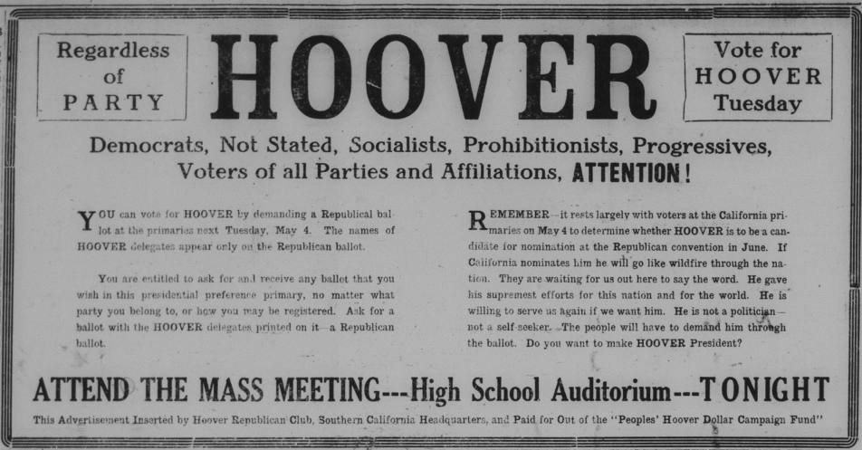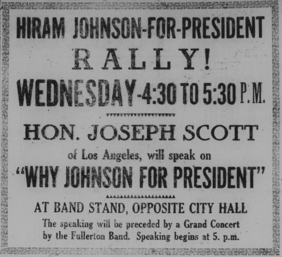 Ultimately, Hiram Johnson won the California primary over Hoover, although Hoover got more votes in Fullerton. This was back when California was a red state.