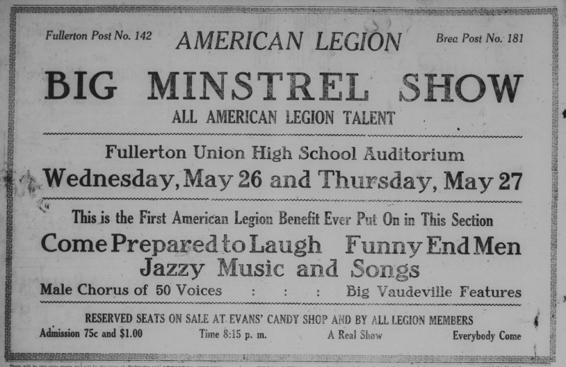 The local American Legion post sponsored a Big Minstrel Show, which presumably featured white performers in blackface.