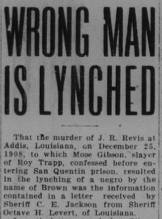 Prior to being hanged, Gibson also confessed to several other murders and crimes across the United States. One of the people he confessed to murdering was J.R. Revis of Louisiana. Unfortunately, a Black man named Brown, it turned out, had been wrongfully lynched for the murder.