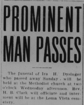 As reported in the Tribune, the following prominent people died: W.B. Houston, former postmistress Gregg, Mrs. Alex Gardiner, Anna Stone, and Ira H. Dysinger.