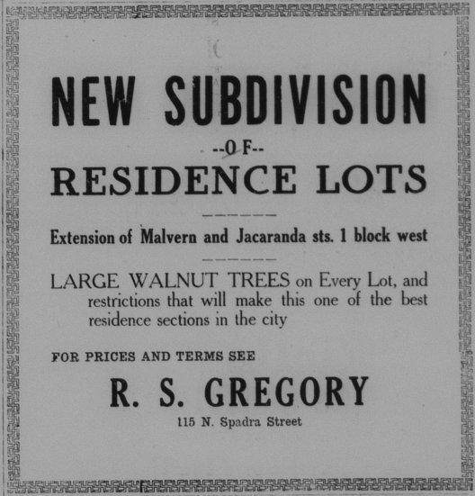 As I mentioned earlier, the 1920s would see a housing and business boom in Fullerton, as new subdivisions were created. In 1920, the Jacaranda tract was created near downtown.