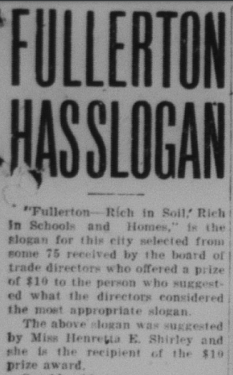 In 1920, Fullerton adopted the slogan, “Fullerton–Rich in Soil, Rich in Schools and Homes.” Having never heard this slogan, I assume it was later abandoned.