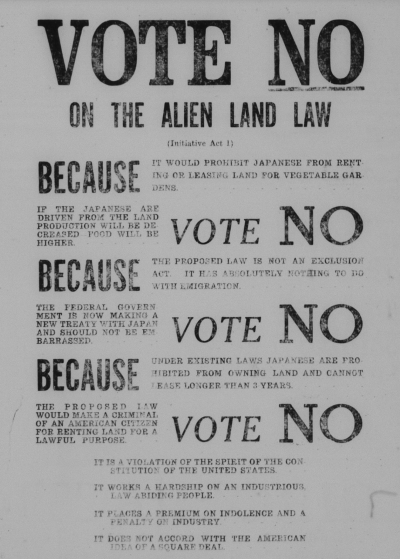 In 1920, anti-Japanese feeling in California was intense. In 1913, the state had passed the Alien Land law, which sought to prevent Japanese immigrants from owning or leasing land.