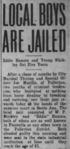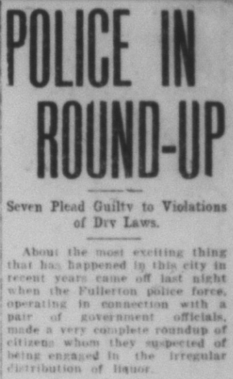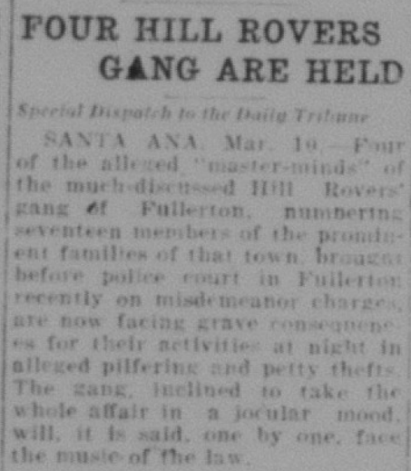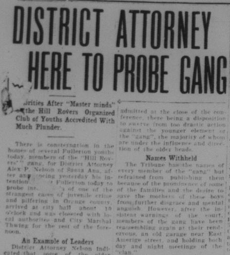 A group of local young men (sons of prominent families) formed a gang (Fullerton’s first gang) called the Hill Rovers. They made much mischief and committed crimes such as petty larceny, breaking and entering, and theft. OC District Attorney Alex Nelson investigated the group.