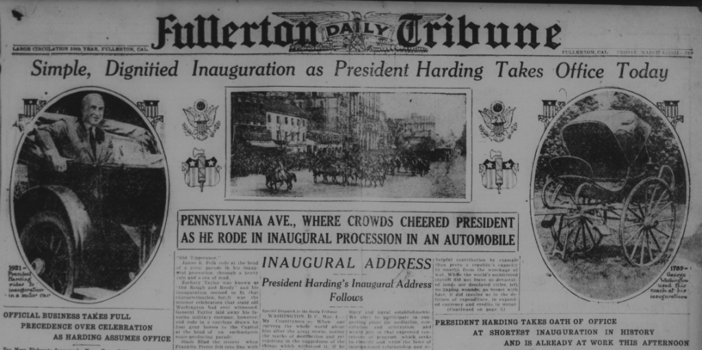 In 1921, Warren G. Harding was inaugurated as president. The governor of California was William Dennison Stephens, Fullerton was represented in congress by Rep. Phil D. Swing, and Fullerton’s mayor was William F. Coulter.