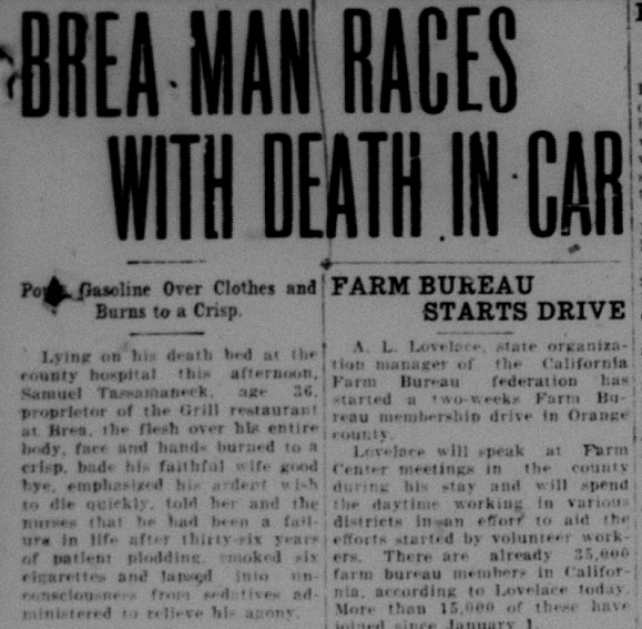 A Brea man named Samuel Tassamaneck committed suicide by dousing himself with gasoline and lighting himself on fire.
