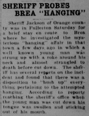 Another crime that went unsolved was the attempted hanging/lynching of a young man in Brea.