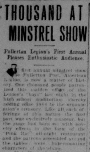 The local post of the American Legion held its annual Minstrel Show, which featured white performers in blackface. About a thousand people attended.