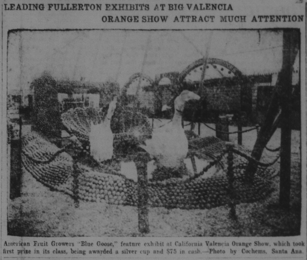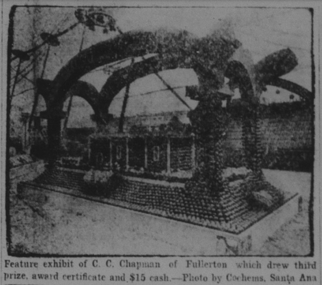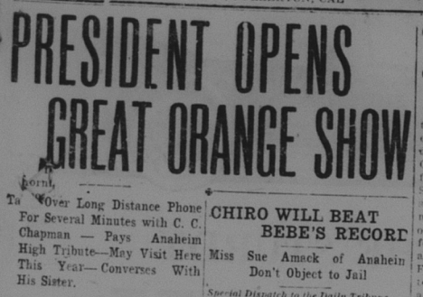 In 1921, local growers held a massive Valencia Orange Show in Anaheim, which featured elaborate exhibits of oranges. Heading up the proceedings was Charles C. Chapman. President Harding even phoned in to praise the Orange Show.