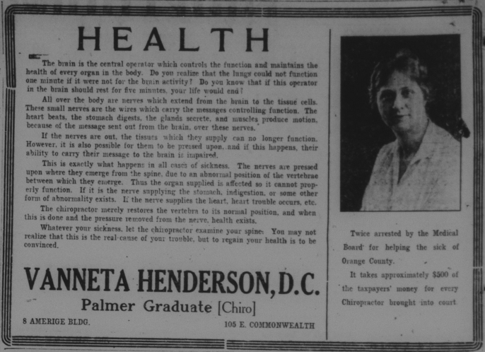 In medical news, local chiropractor Vanetta Henderson faced charges for violating the Medical Practices Act. At this time, chiropractors were viewed with skepticism. I guess not much has changed.
