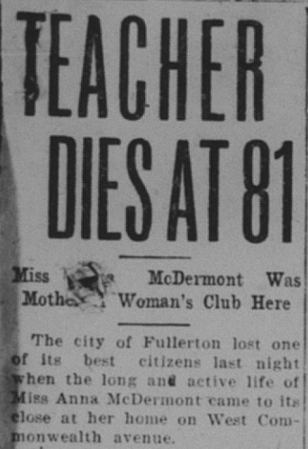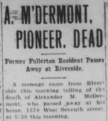 Fullerton pioneer Alex McDermont passed away, and shortly thereafter his sister Anna McDermont died as well. I plan to write more on this interesting and influential family in a future post.