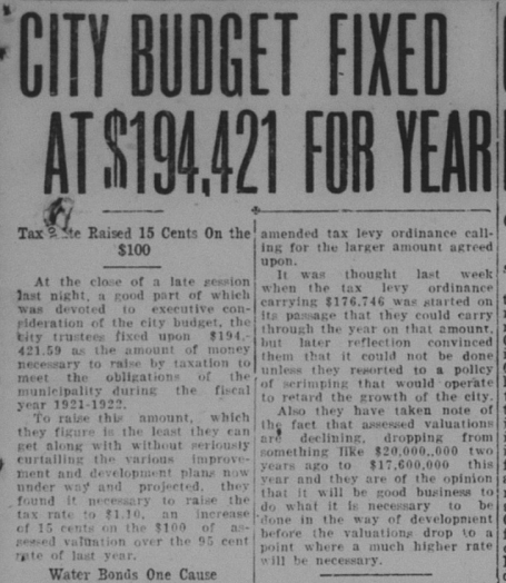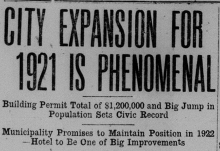 An article entitled “Building Boom On” states, “With five new business buildings under way in the downtown section, a new grammar school and scores of dwellings being erected in the outlying districts the activity in this direction has been most marked, and is entirely gratifying to all who are interested in the city’s progress…In addition to the above the new public work on sewers and lights have given employment to many men, and the water extension construction to begin in the near future, will swell the total to many more.”