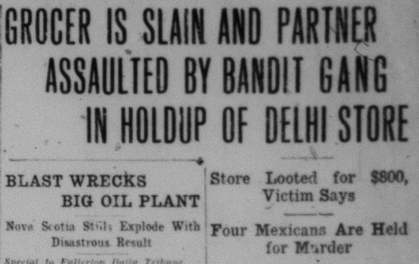 A Syrian grocer named John Khoury was shot and killed in a holdup by a “bandit gang.” Khoury’s uncle Isaac Matouk was seriously wounded in the crime. The men charged with the crime in the Delhi grocery were M. Carillo, Jean Garcia, Julian Castro, and E. Hinajos.