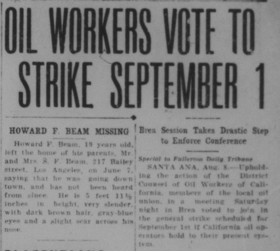 However, in 1921, all was not well in the local oil fields. Unhappy with wages and working conditions, Brea oil workers (who had recently unionized) voted to strike.