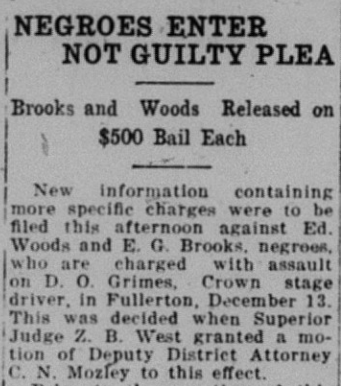 A notable criminal case involved two Black men (E.G. Brooks and Eddie Woods) who allegedly assaulted a bus driver (Darwin O. Grimes) in Fullerton, after he tried to make them sit at the back of the bus.