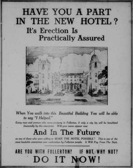 In 1921, Fullerton business owners and residents began raising money for what would become the California Hotel (now called Villa del Sol), which would open in 1923.