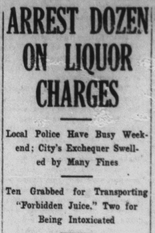 In 1923, Prohibition was in full effect, and local law enforcement struggled to keep up with all the bootlegging. Nearly every issue of the Tribune has a story about people being fined of arrested over illegal booze.