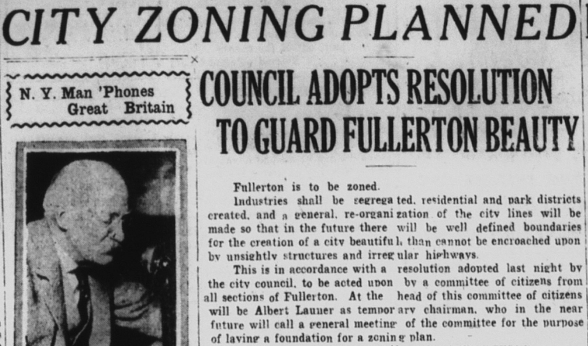 In 1923, Fullerton first adopted zoning–a city planning tool that establishes what can and can’t be built in certain areas. The idea is to create orderly development, with clearly-defined business, residential, and industrial areas.